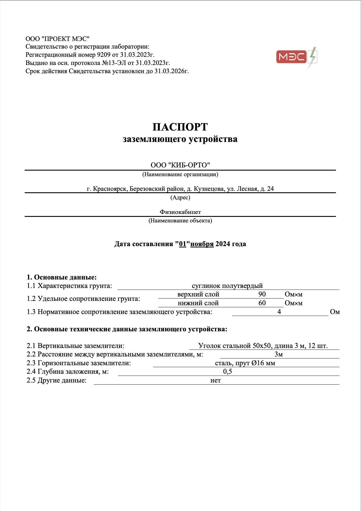 "Паспорт заземляющего